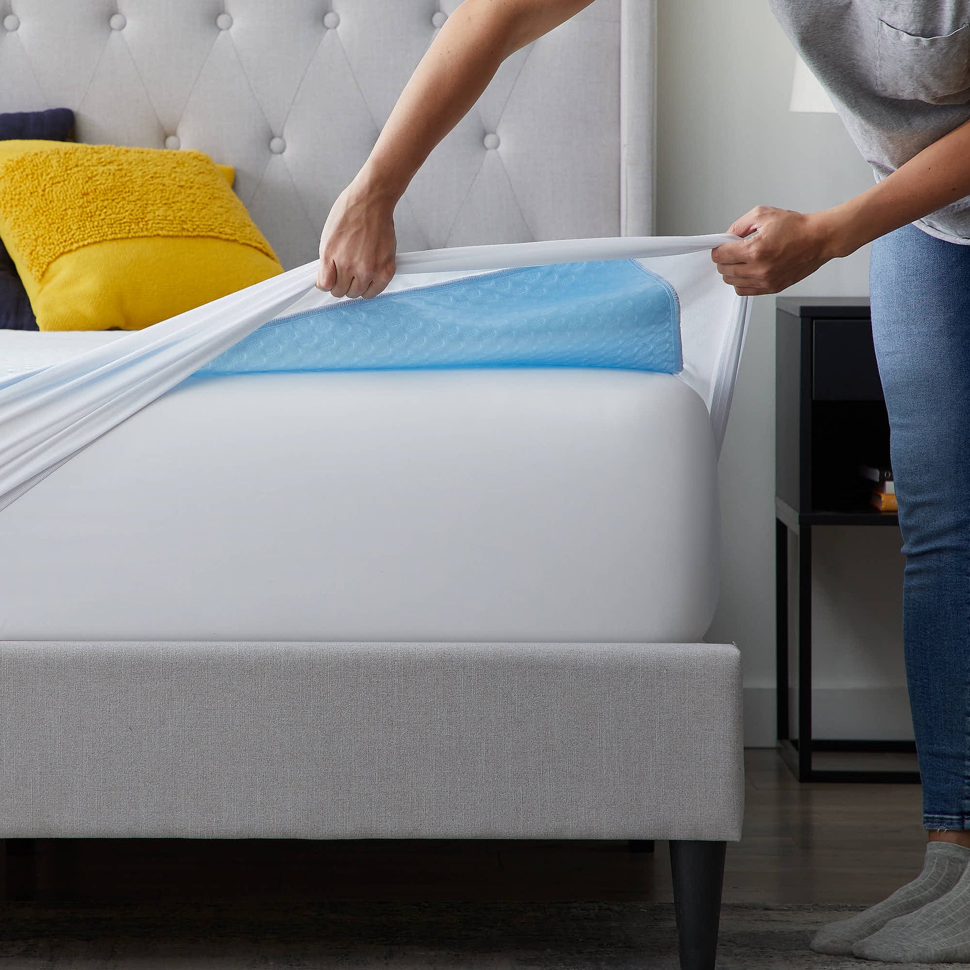 The instant cooling effect of this protector helps manage temperature as you fall asleep. The central layer is 100 percent polyurethane to shield from spills and accidents, while remaining quiet, cool, and breathable. The fitted-sheet style fits snugly to mattresses up to depths of 18 inches.