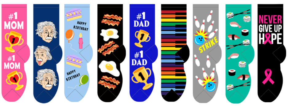 Our collection of $5.00 silly and funny socks is perfect for yourself, family and friends. Have a great time showing off your favorite pet or hobbie!